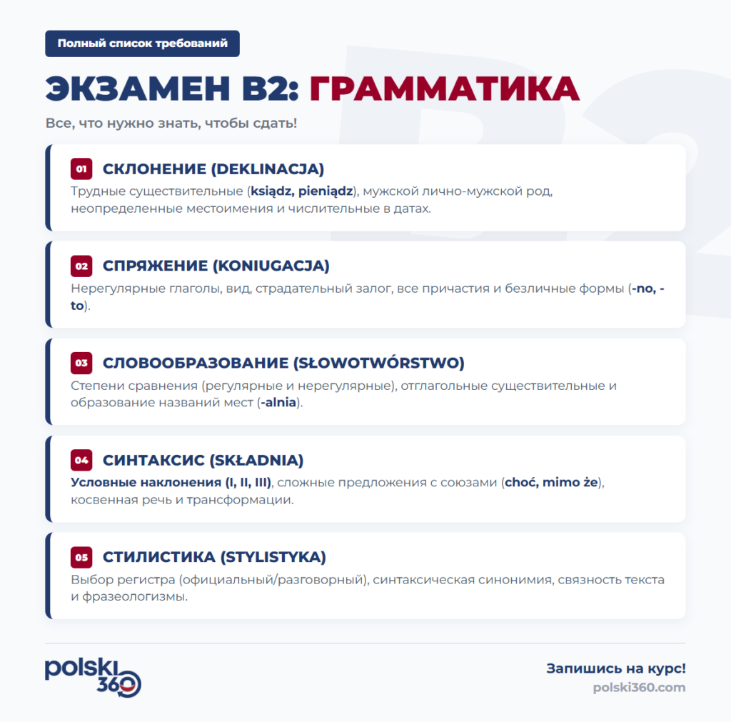 В этой статье я проведу Вас через все экзаменационные требования, укажу на ловушки, подстерегающие в грамматике, и подскажу, как подготовиться с Polski360, чтобы без лишнего стресса получить заветный документ.
